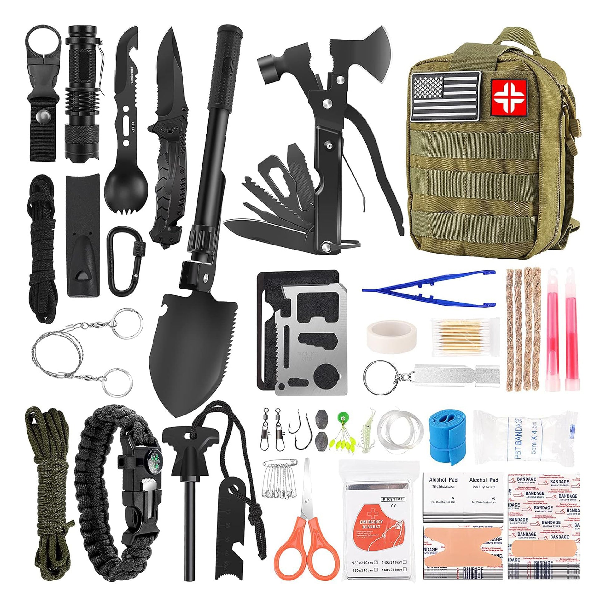 A complete survival and first aid kit covering shelter, tools, fire, navigation, medical care, and emergency signaling.