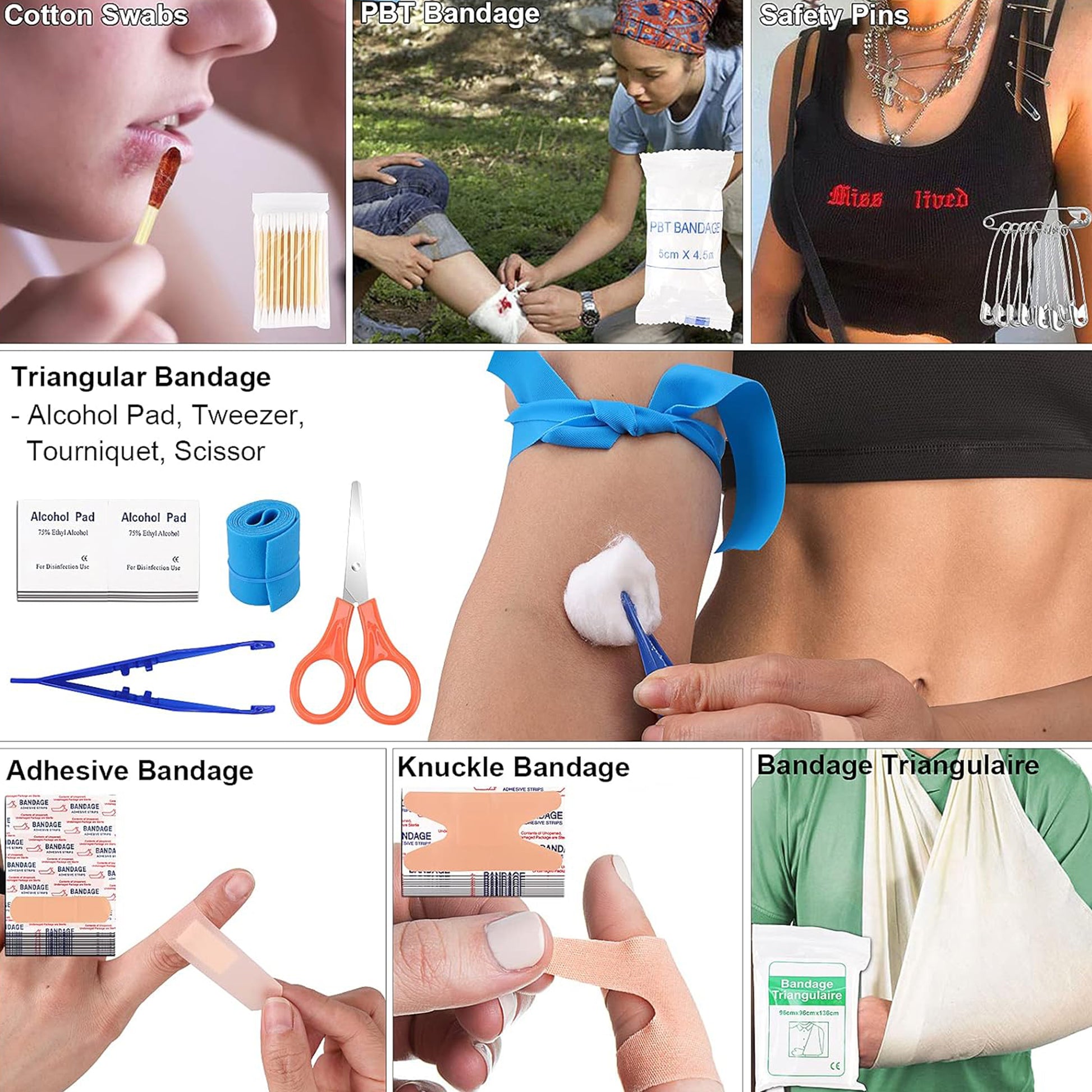 Fully stocked first aid kit with bandages, tourniquet, medical tape, antiseptic tablets, gauze, scissors, and emergency blanket.